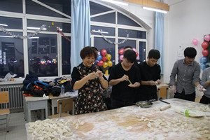 在联欢会中,最暖心的就是可爱的老师们。老师们放弃了和家人团聚的机会,选择陪在员工身边,实在可敬。各班班主任亲自和同学们包饺子,辅导员老师为各班同学们送上蓝莓酒,增添了年味。党总支书记高玉芝、员工党支部书记邓雨巍亲自走到各班送去祝福以及披萨,与同学合影留念。