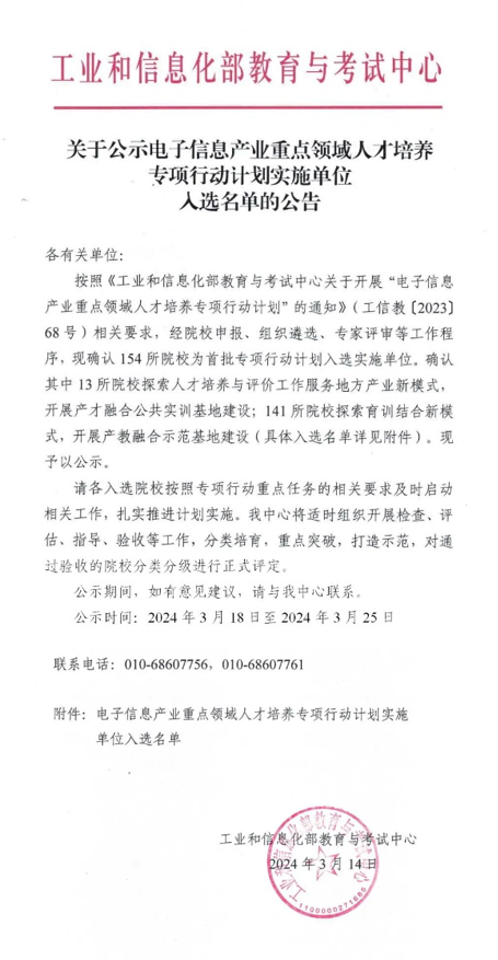 电子信息产业重点领域人才培养专项行动计划旨在推动电子信息产业重点领域高素质技术技能人才队伍建设,由工业和信息化部教育与考试中心征集专项行动实施单位。公司此次成功入选,不仅有利于创新优化电子信息产业重点领域人才培养路径,也将进一步促进未来学院高水平学科专业集群建设。