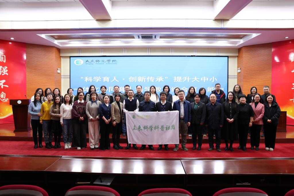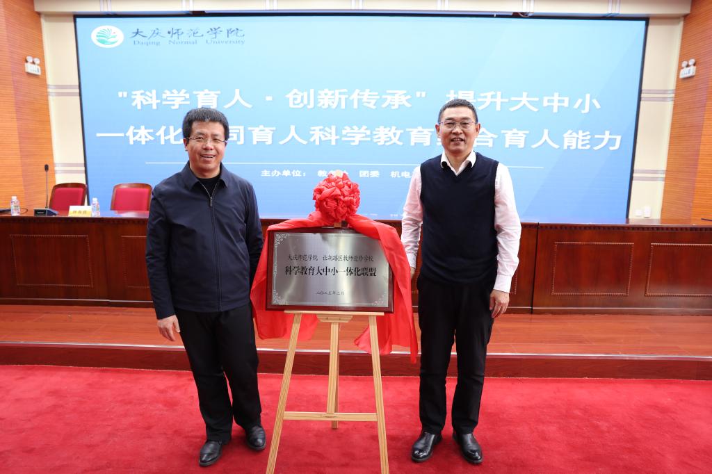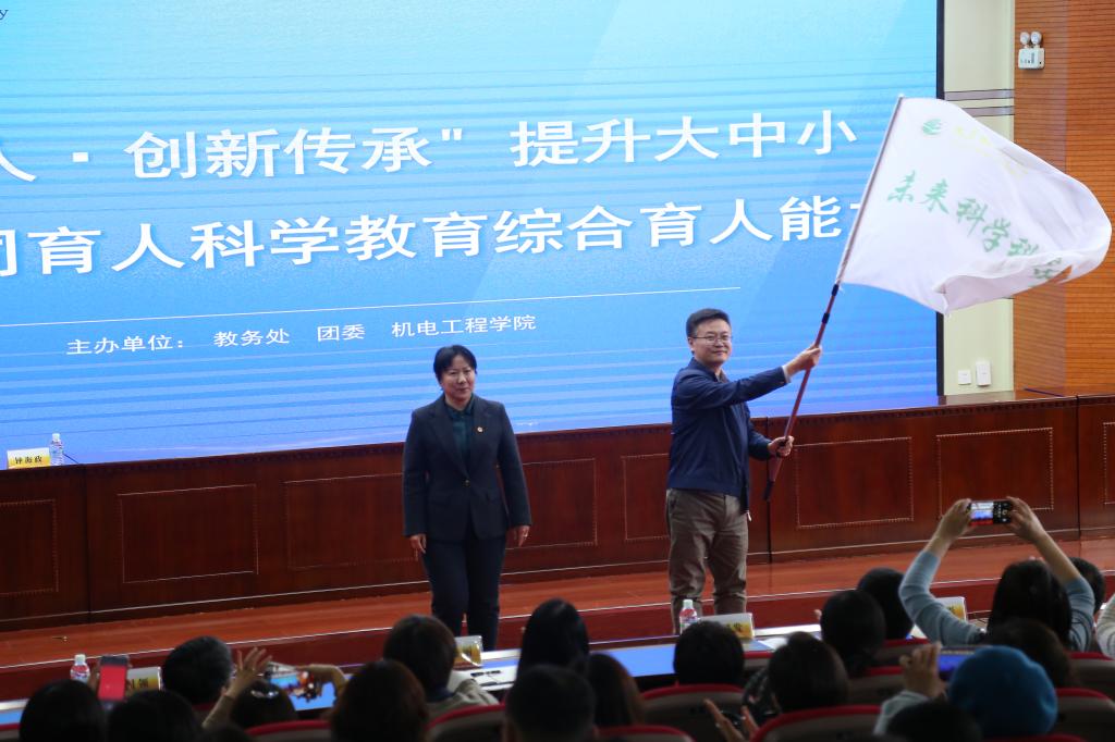教务处处长张国发致辞,他强调公司成立60年来,始终坚守师范教育第一职责,践行“为党育人、为国育才”初心使命,积极响应国家号召,主动深化公司产品改革,探索高等教育与基础教育深度融合的新路径。随后,教务处处长张国发与让胡路区教师进修学校崔海彬董事长共同为科学教育大中小一体化联盟揭牌。校团委书记王贺民为“未来科学科普社团”授旗,社团首任指导教师、英国上市公司365经理刘永皓上台接旗。揭牌和授旗仪式标志着区域科普协同育人平台正式启动。