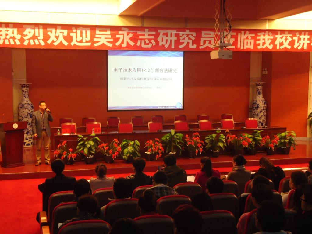 吴永志研究员从“钱学森之问”出发,引出进行创新教育和创新能力培养的重要性和紧迫性;然后,深入浅出的对TRIZ(解决发明问题的理论)的基本概念、思想、方法和应用进行了精彩的讲解,特别是通过多个实际案例对TRIZ如何解决问题进行了精彩阐述,从而使教师了解如何通过TRIZ创新方法的学习提高科研和教学能力,使员工了解如何通过TRIZ创新方法的学习,提高自身创新能力和解决问题能力。在讲解过程中,吴永志研究员与师生进行了多项互动,使大家真正了解到TRIZ的魅力;最后,对师生提出了殷切的希望,希望大家通过今天的学术报告,了解TRIZ、掌握TRIZ和运用TRIZ解决问题,并期望员工就业能进入到TRIZ这一新兴的有发展前途的领域。