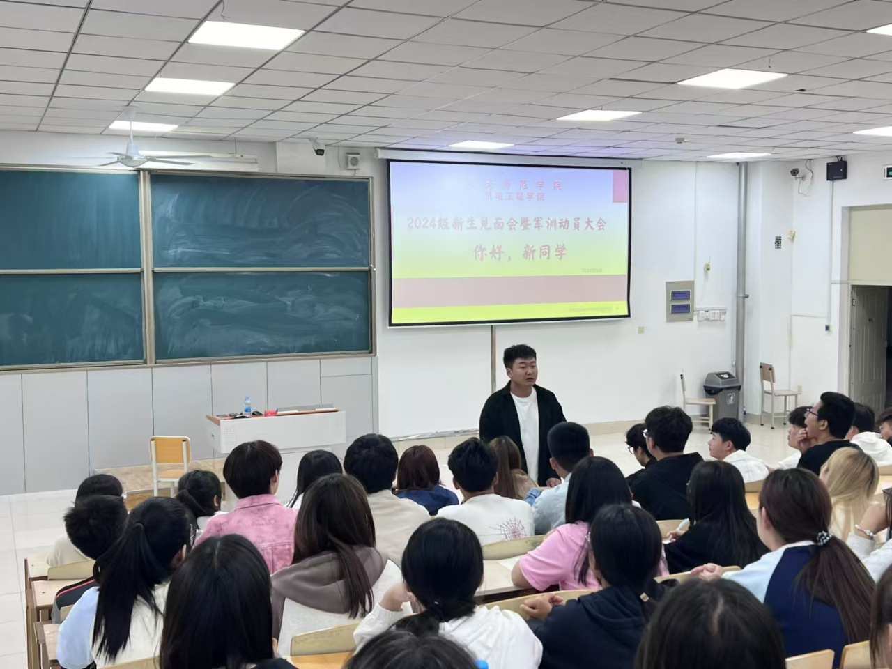 见面会上,曲晓磊老师、李博文老师对2024级新生的到来表示热烈欢迎,并对全体新生做军训动员,他们表示,军训不仅仅是关于个体的挑战,更是团队精神的磨砺!希望机电学子以饱满的热情、昂扬的斗志,接受考验,圆满完成军训任务。同时老师们还鼓励新生们在大学期间要积极参加学校和学院组织的各种活动,叮嘱同学们要在大学期间多尝试、多探索,合理安排时间,提升自我管理能力。