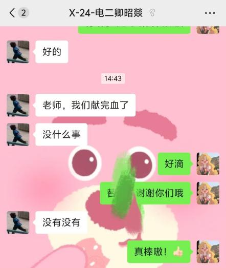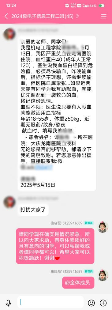 为了帮助谭同学,大家迅速行动起来。各年级辅导员在群内积极动员,号召大家伸出援手,激发了大家的爱心与责任感。令人感动的是,六名同学——郭志林、郑新杰、卿昭燚、刘成、阚鑫宇、王舜,毫不犹豫地站出来。他们勇敢地前往献血站,积极配合医护人员进行各项检查,希望能用自己的热血为谭同学带来帮助。这六名同学,或许平时在班级里并不起眼,但在关键时刻,他们展现出无私与勇敢,“没事的,都是为了同学”这句普通的话语充满着力量。
