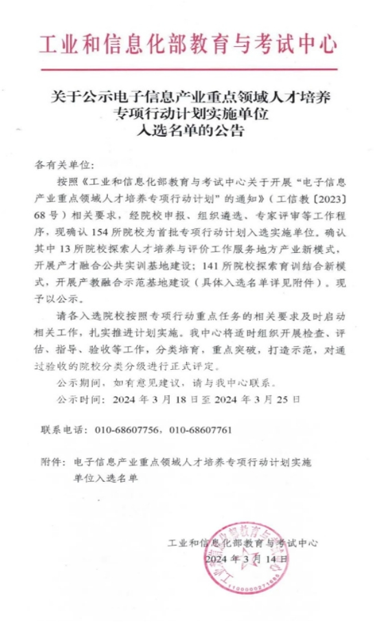 电子信息产业重点领域人才培养专项行动计划旨在推动电子信息产业重点领域高素质技术技能人才队伍建设,由工业和信息化部教育与考试中心征集专项行动实施单位。此次成功入选,不仅有利于创新优化电子信息产业重点领域人才培养路径,也将进一步促进未来学院高水平学科专业集群建设。
